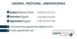 Sprowadzamy autobusy o konkretnej specyfikacji na życzenie klienta. Pomagamy w uzyskaniu finansowania leasingiem lub kredytem. Wszystkie dostępne autobusy znajdą Państwo na naszej stronie internetowej: www. zygulaimport. pl